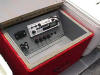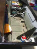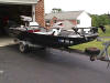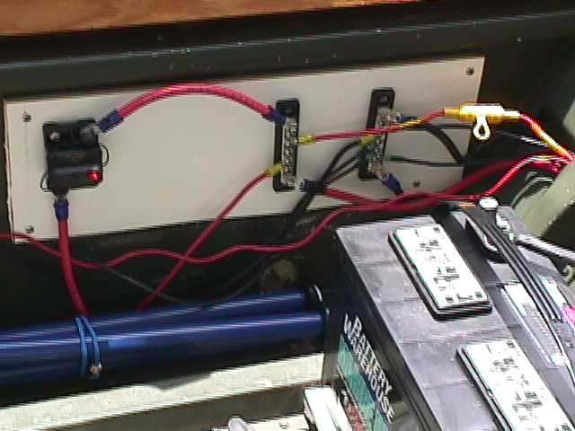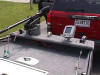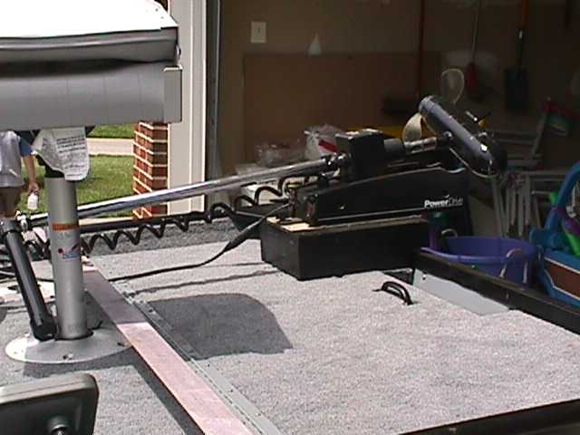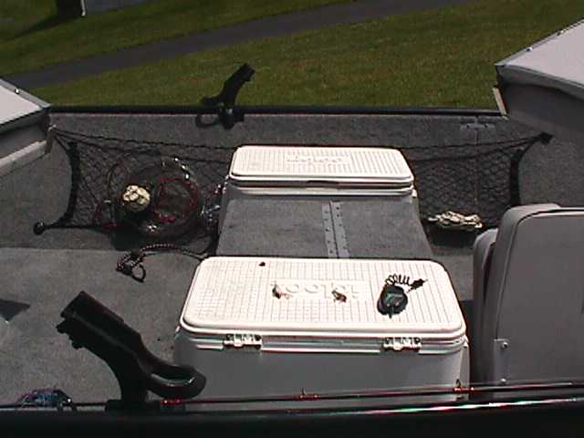The wiring from the main distribution panel then runs to a fuse panel in the center console.  The boat is equipped with a 2 trolling motors (36 & 28 lb), AM/FM Cassette stereo (the speakers are mounted in the front bulk head facing aft), live-well pump, live-well timer & aerator, 2 courtesy lights (mounted fore & aft on the center console), bilge pump, running lights, fish finder, anchor-mate, 4 rod holders, rod storage rack, cargo storage net and the front storage hatch is carpeted and  has a custom made utility box organizer.